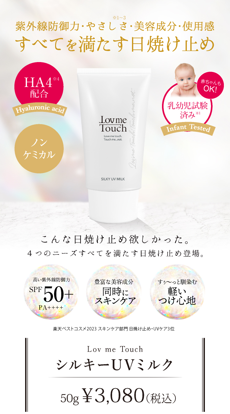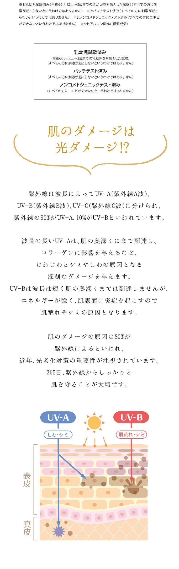 | 特徴 | 「高い紫外線防御力」「肌へのやさしさ」「ストレスのない使用感」「充実の美容成分」日焼け止めに欠かすことのできない4つのニーズ、全てにこだわり抜いた日焼け止めです。SPF50+ PA++++と高い数値でありながらも、紫外線吸収剤フリーで肌への負担を抑えたやさしい処方設計だから、赤ちゃんの肌にもご使用いただけます。保湿成分スーパー低分子ヒアルロン酸HA4(ヒアルロン酸Na)の他、群馬県碓氷産の最高品質シルクから抽出した成分「フィブロイン」、整肌成分フラーレン、セラミドなどを配合し、紫外線によるダメージから肌をまもります。軽いつけ心地で、真夏のレジャーだけでなく365日毎日の紫外線対策におすすめです。 ※乳幼児試験済み(生後6か月以上~3歳までの乳幼児を対象とした試験) (すべての方に刺激が起こらないというわけではありません) ※パッチテスト済み (すべての方に刺激が起こらないというわけではありません) ※ノンコメドジェニックテスト済み (すべての方にニキビができないというわけではありません) ※紫外線吸収剤フリー |