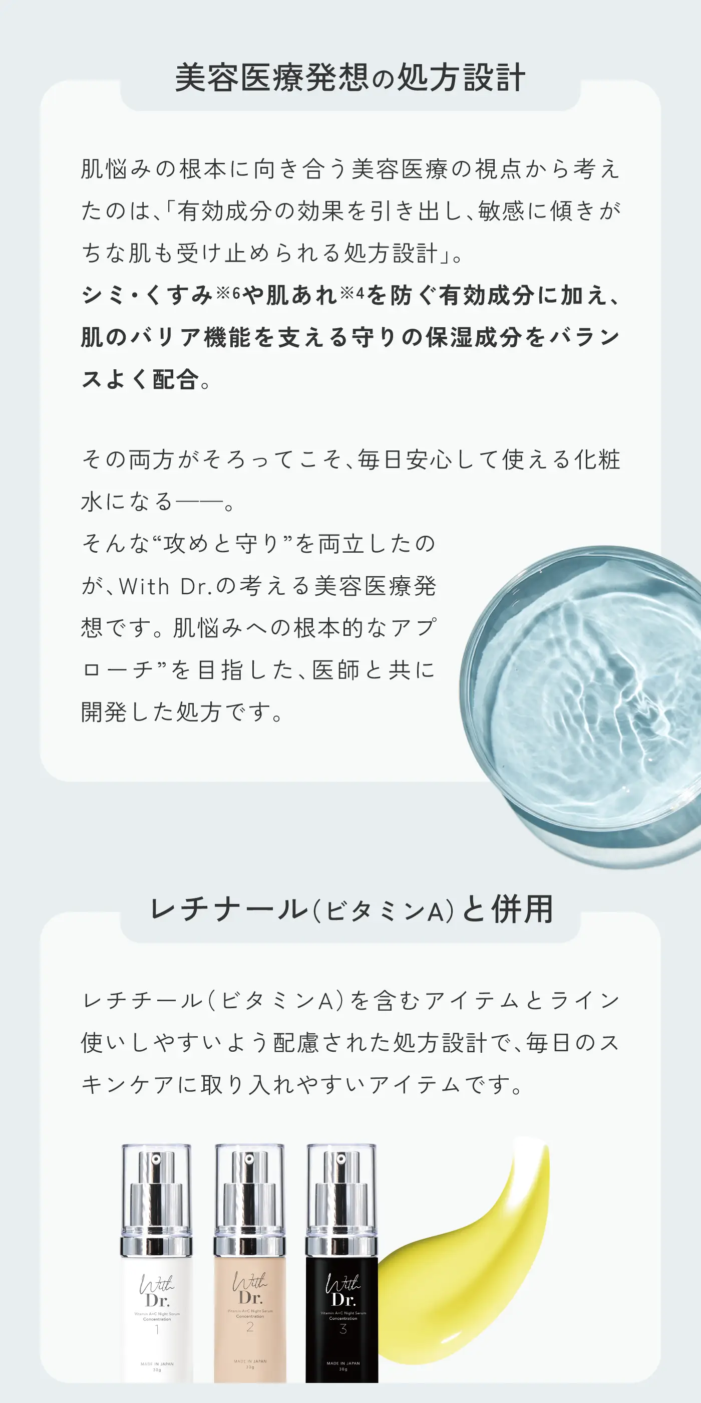 肌悩みの根本に向き合う美容医療の視点から考えたのは、「有効成分の効果を引き出し、敏感に傾きがちな肌も受け止められる処方設計」。